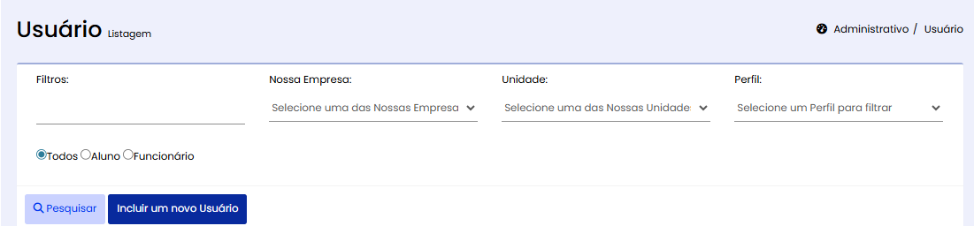 Para excluir o cadastro de um aluno sem matricula, selecione o Módulo Administrativo >> Usuário >> pesquise pelo Aluno (nome/e-mail/CPF)