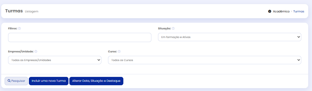 Situação é o status da turma no sistema, você deverá selecionar uma das opções abaixo para sua turma: