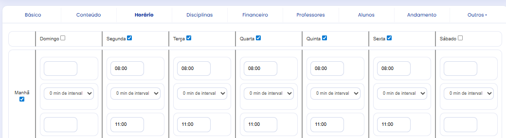 Exemplo de uma turma que terá aulas de segunda a sexta das 8h às 11h