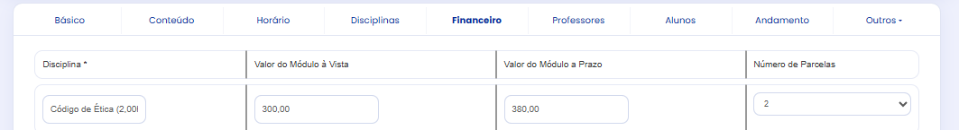 Valor: valor de custo da turma (este é o valor da turma que o usuário irá pagar).