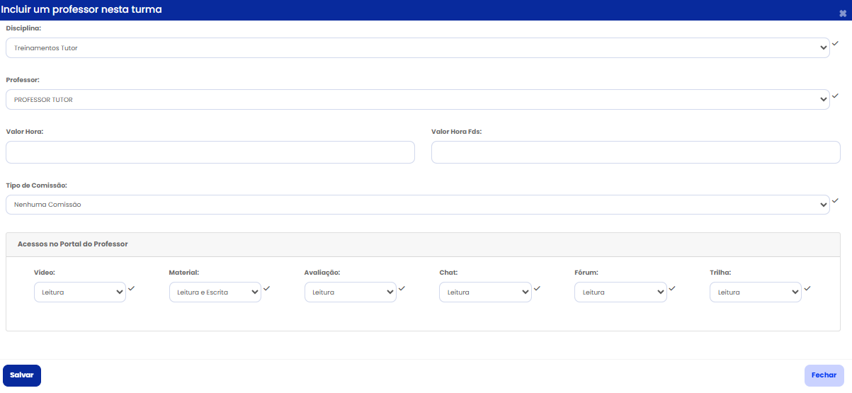 Nesta aba deverão ser selecionados os professores que farão parte do corpo docente da turma e quais ações eles poderão acessar pelo Portal do Professor.