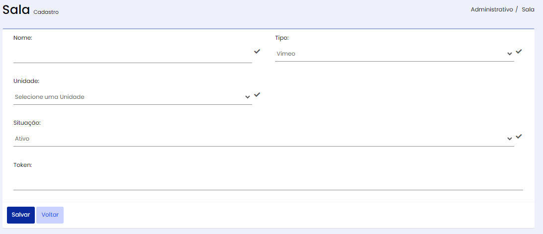 Acesse Módulo Administrativo >> localize o menu Sala >> clique em Incluir uma nova Sala