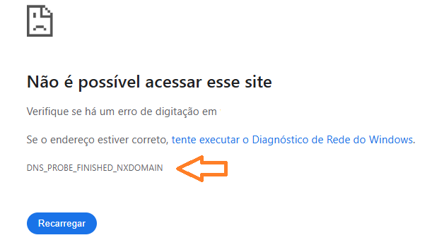 A mensagem (DNS_PROBE_FINISHED_NXDOMAIN) exibida ao tentar acessar o endereço do site está relacionada a uma falha na resolução de DNS do domínio.