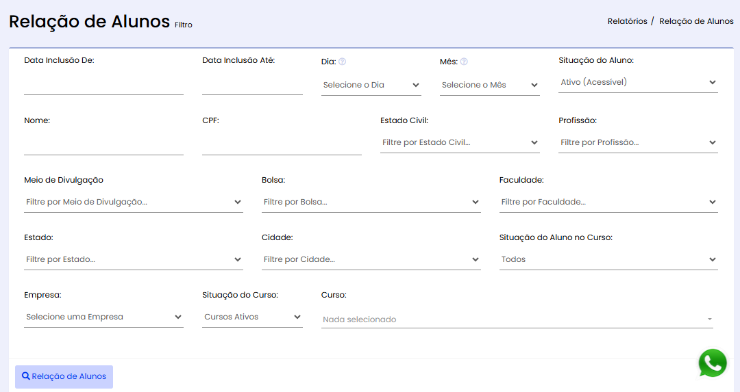 Situação do Aluno no Curso: filtro por situação do aluno no curso Ativo ou Encerrado ou Cancelado ou Reserva