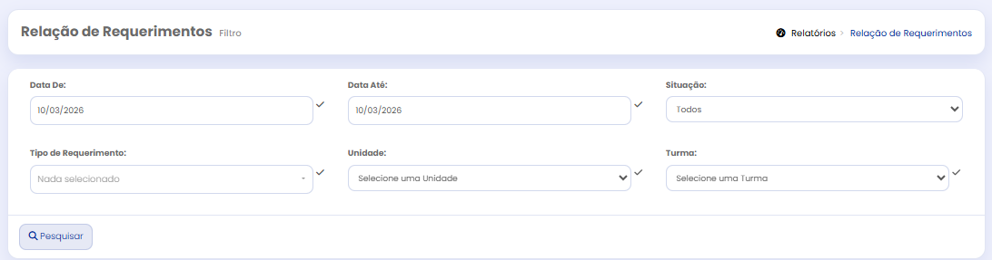 O Relatório Relação de Requerimentos permite acompanhar todas as solicitações registradas pelos alunos na tela de requerimentos, facilitando o controle administrativo, o acompanhamento e a gestão das demandas.