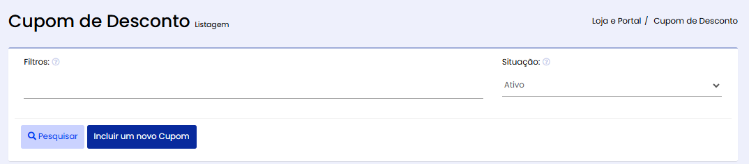 1) Acesse o Módulo Loja e Portal > Menu Cupom de Desconto > clique no botão Incluir um novo Cupom