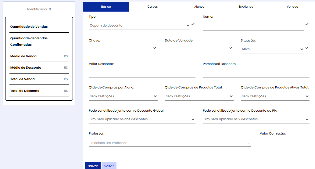 Professor ou Afiliado: se o cupom de desconto estará vinculado a um professor(a) Valor Comissão: preenchimento do valor de comissão
