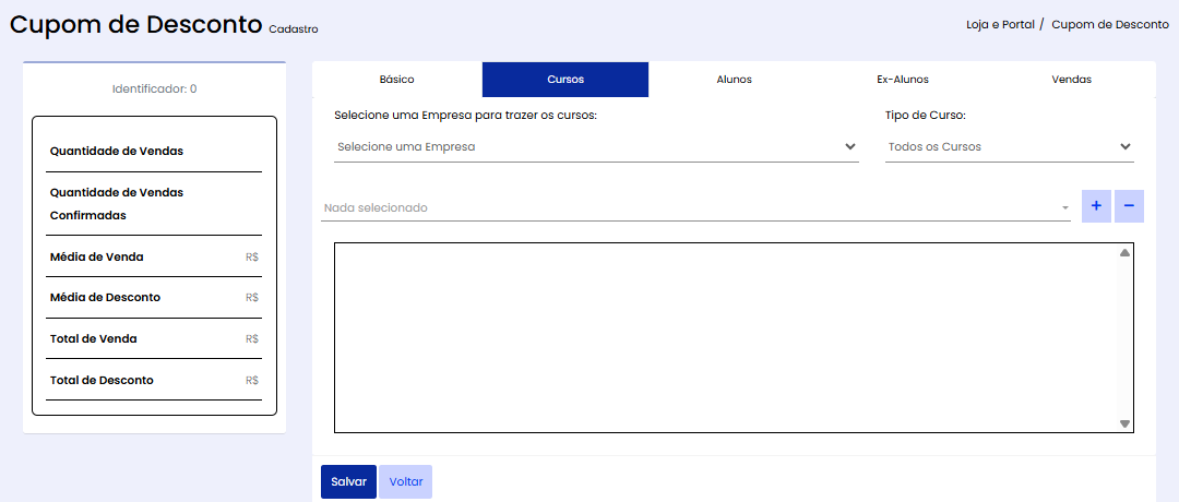 Escolha a Empresa > Selecione o(s) Curso(s) na listagem > clique no sinal + para adicionar os cursos que serão vinculados ao cupom de desconto.