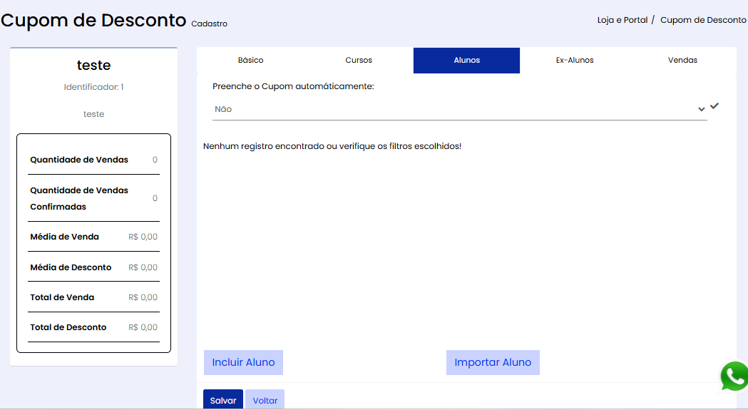 1ª. INCLUIR ALUNO - Disponibilização Individual do cupom de desconto para aluno ou não aluno com o preenchimento do CPF e Nome