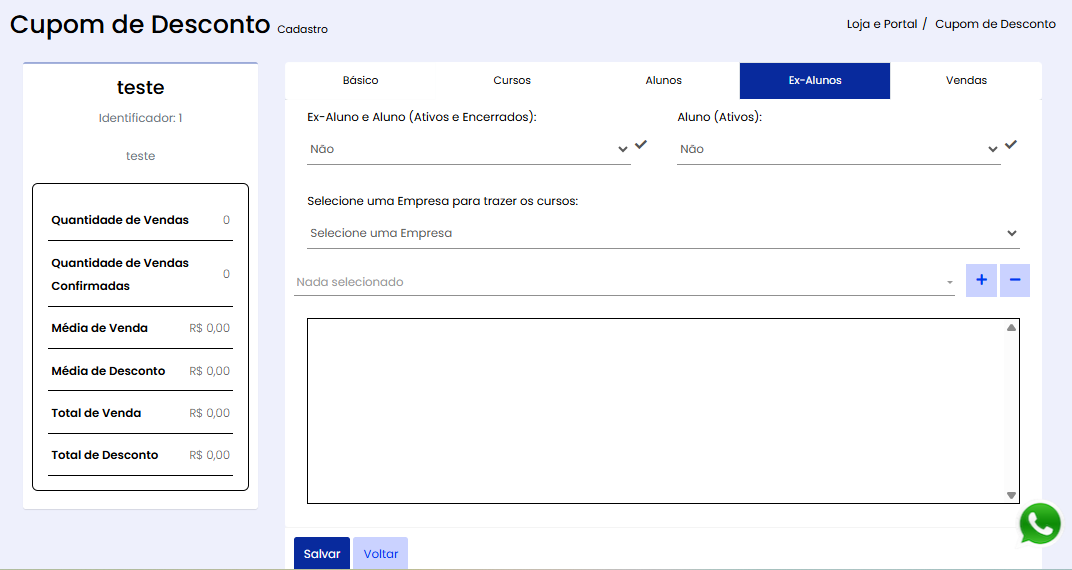 Selecione uma das opções > Ex-Aluno e Aluno (Ativos e Encerrados) ou Liberação para Alunos (Ativos) > clique no sinal + para adicionar os cursos que serão vinculados ao cupom de desconto.