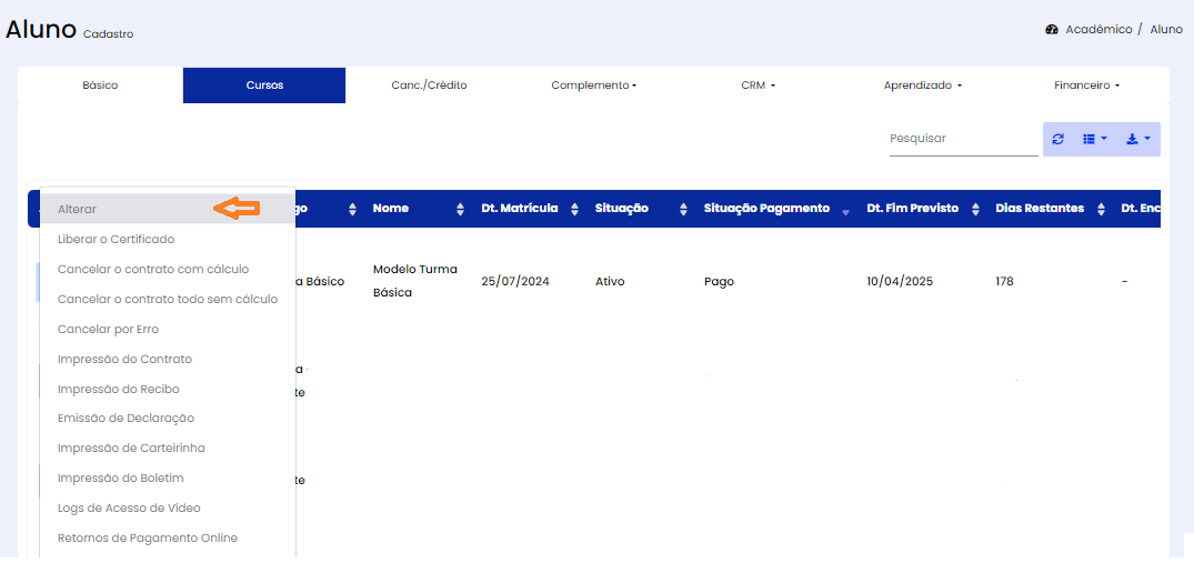 Selecione o Módulo Secretaria ou Acadêmico >> selecione a página Alunos >> faça a busca pelo aluno que deseja alterar o status do contrato >> clique em Alterar no Botão de Ações a frente do cadastro do aluno.