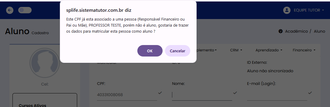 > Caso deseje cadastrar um funcionário/professor/afiliado como aluno, para evitar a duplicação de cadastro no sistema, copie e cole o CPF que do usuário e depois clique no campo do nome, o movimento exibirá a tela para trazer os dados já existente para o cadastro do usuário como aluno(a).
